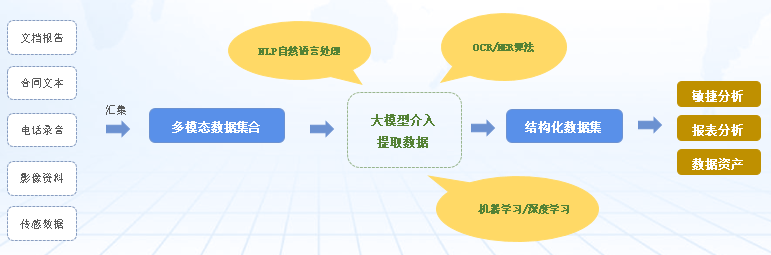 “智析”利用大模型的文本识别、分类标注、NLP和机器学习技术,结合OCR、NER等算法实现图片、文档等各种不同媒体模态中的结构化数据的提取、加工和处理。如下所示: