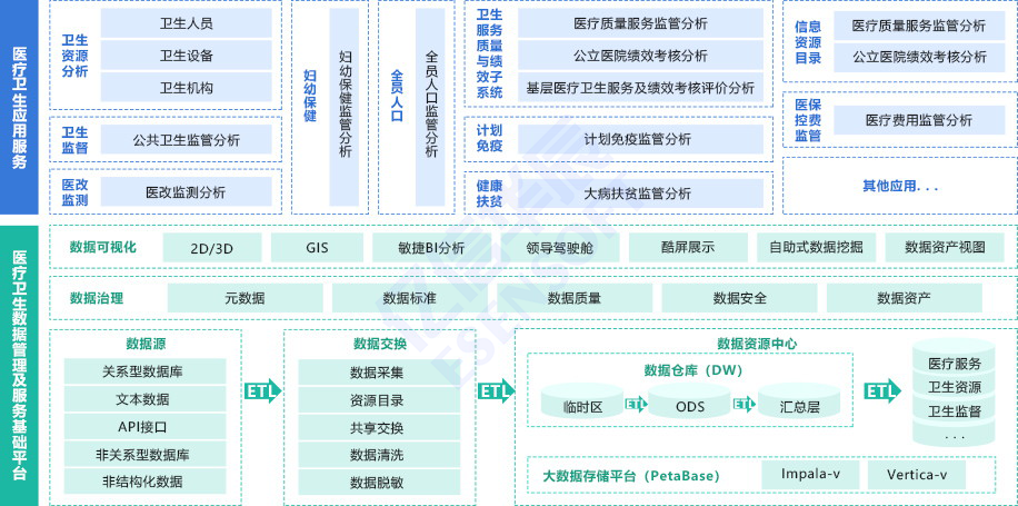 紧跟医疗卫生领域开展趋势,面向国家、省市卫健委及各级医疗卫生组织,给予灵活、可适配的解决方案,面向国家、省市卫健委及各级医疗卫生组织给予集数据采集、数据治理(含元数据、数据标准、数据质量、数据生命周期管理、数据安全)、数据分析与挖掘、数据服务及可视化展示为一体的大数据服务,建立长效灵活的数据采集机制(如面对突发公共卫生事件或流行性传染病等情况),数据治理体系等,提升医疗卫生数据质量,辅助决策,提升管理水平。